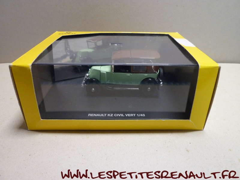 Modèle : 6cv type NN1 Coupé de Ville Année : 1927 Couleur : verte et marron Echelle : 1/43 Fabricant : Eligor Référence : 7711223583 Collection : Non Matière : Zamak, châssis plastique Série limitée : Non Boitage : Boite cristal + surboite Commentaires : Socle indiquant un type KZ, mais il s'agit d'un type NN1 (ou NN2) |