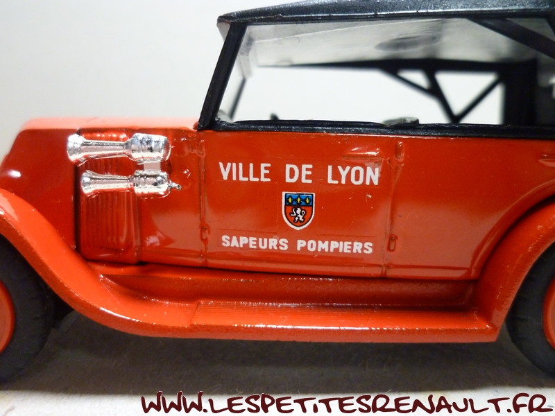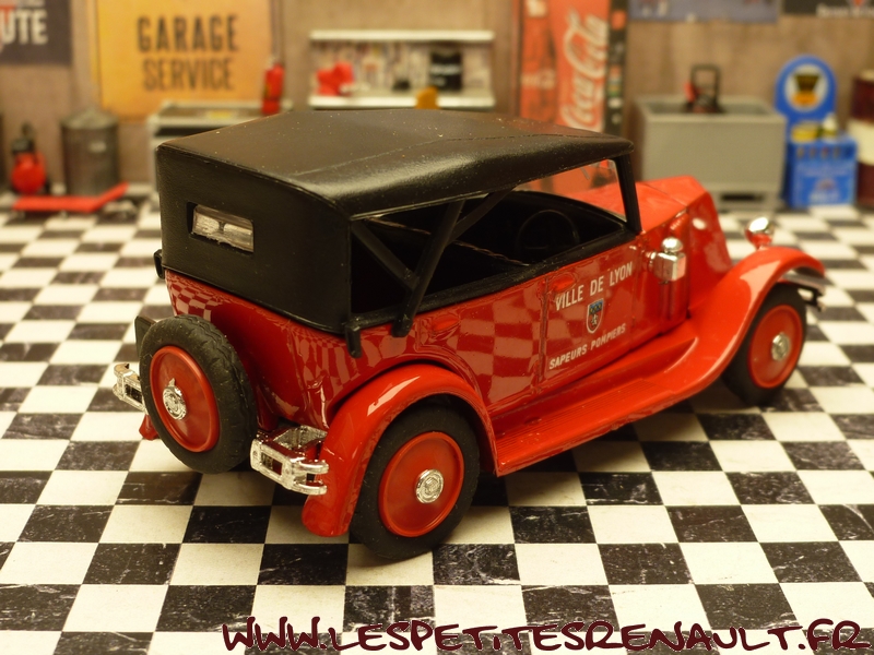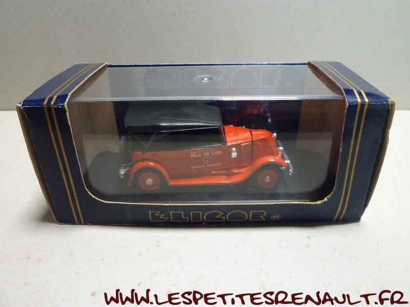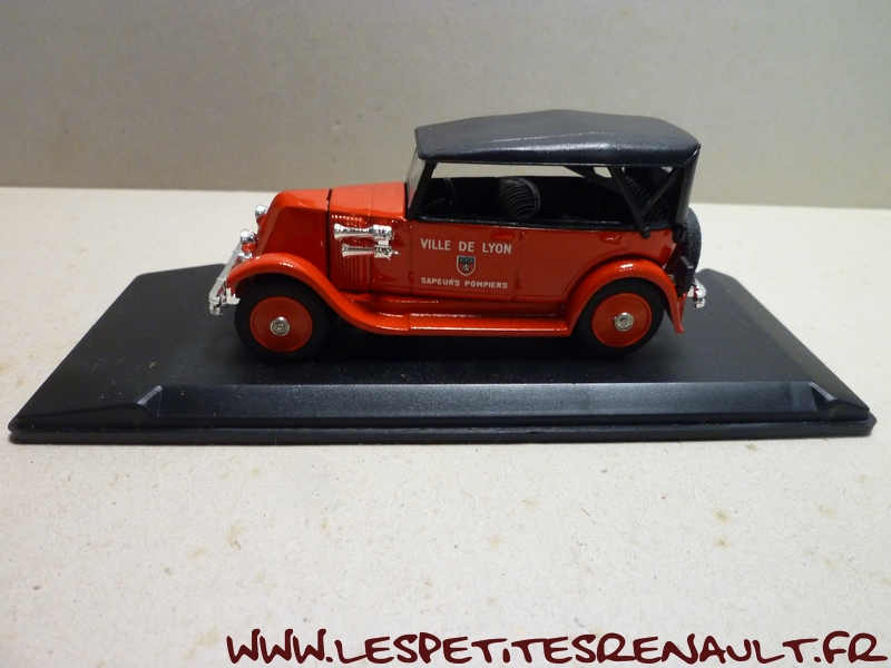 Modèle : 6cv type NN1 Torpedo Année : 1928 Couleur : Rouge Echelle : 1/43 Fabricant : Eligor Référence : 1040P Collection : Non Matière : Zamak, châssis plastique Série limitée : Non Boitage : Boite cristal + surboite Commentaires : Version Sapeurs Pompiers avec marquage latéral "Ville de Lyon - Sapeurs Pompiers". Modèle indiqué comme [NN 1927] mais un torpédo avec la présence du pare-chocs doubles et des ailes galbées en font un type NN1 (ou NN2) de 1928. Version capotée avec ailes et caisse rouge et capote noire |