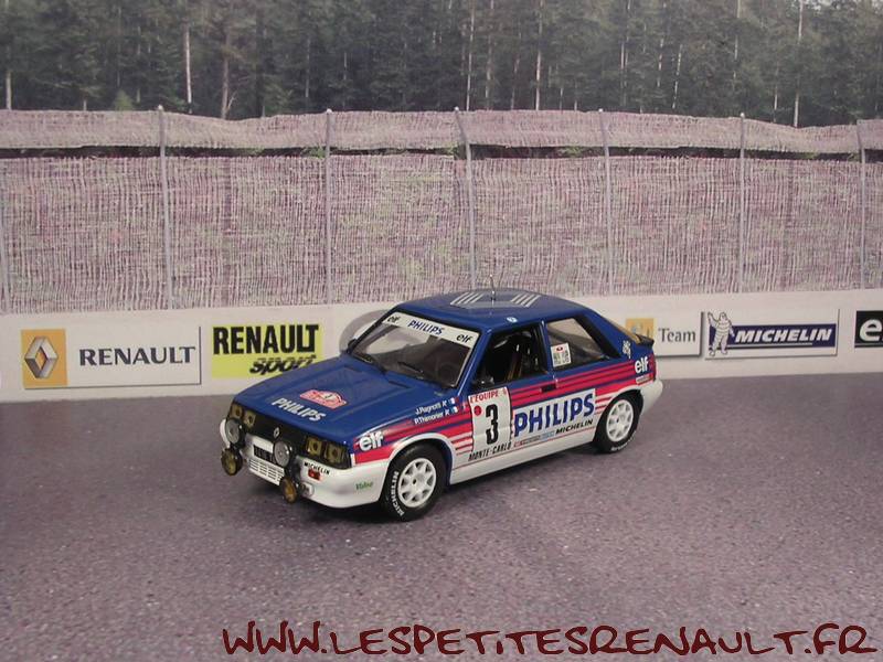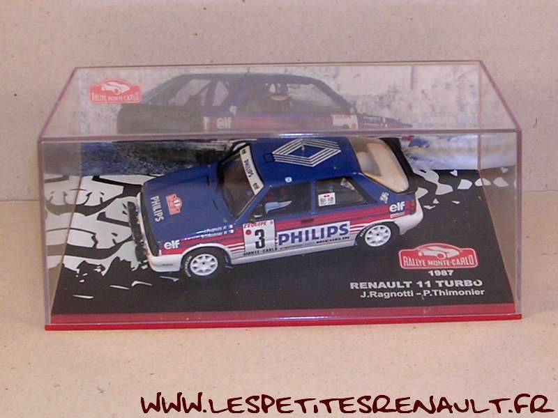 Modèle : Renault 11 Turbo ph1 Année : 1985 Course : Rallye de Monte Carlo Equipage : #3 - Ragnotti / Thimonier Couleur : Blanche et bleue Echelle : 1/43 Fabricant : Ixo Référence : 13 Collection : Rallye de Monte Carlo (Altaya) Matière : Zamak, châssis plastique Série limitée : Non Boitage : Boite cristal 7x15 Commentaires : Ragnotti et Thimonier se classeront 6ème au général |