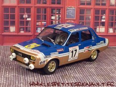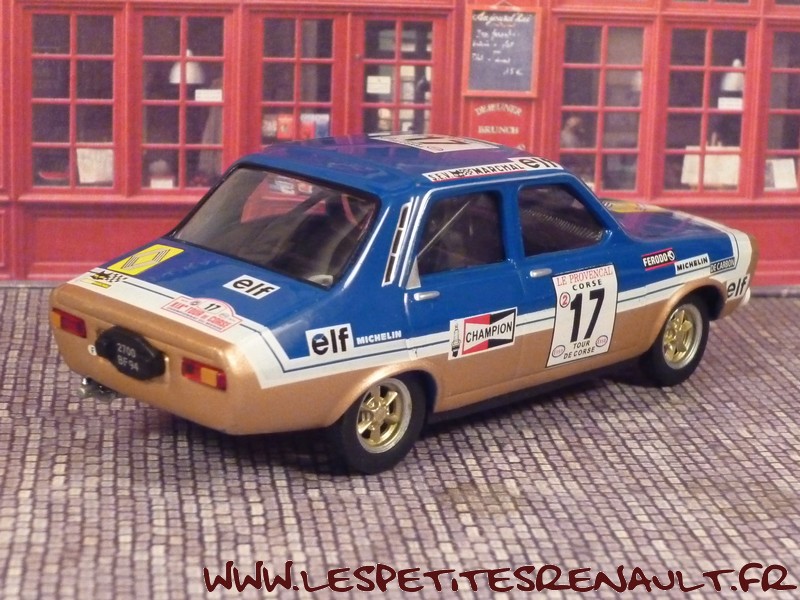 Modèle : Renault 12 Gordini Année : 1975 Course : Tour de Corse Equipage : #17 Pironi-Bonamour Couleur : Bleue et or Echelle : 1/43 Fabricant : Ixo Référence : 22 Collection : Saga Gordini (Atlas) Matière : Zamak, châssis plastique Série limitée : Non Boitage : Boite cristal + surboite carton Commentaires : Renault 12 Gordini prêtée par Jean-Claude Chervier. La voiture est engagée en groupe 2, ce modèle n'ayant jamais été homologué en groupe 1 |