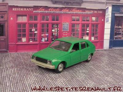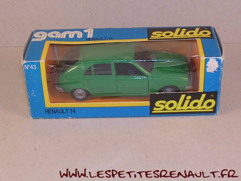 Modèle : Renault 14 TL Phase 1 Année : 1976 Couleur : Verte Echelle : 1/43 Fabricant : Solido Référence : 43 Collection : Gam 1 (Solido) Matière : Zamak, châssis plastique Série limité : Non Boitage : Boite carton + plastique Commentaires : Modèle avec portes avant ouvrantes |