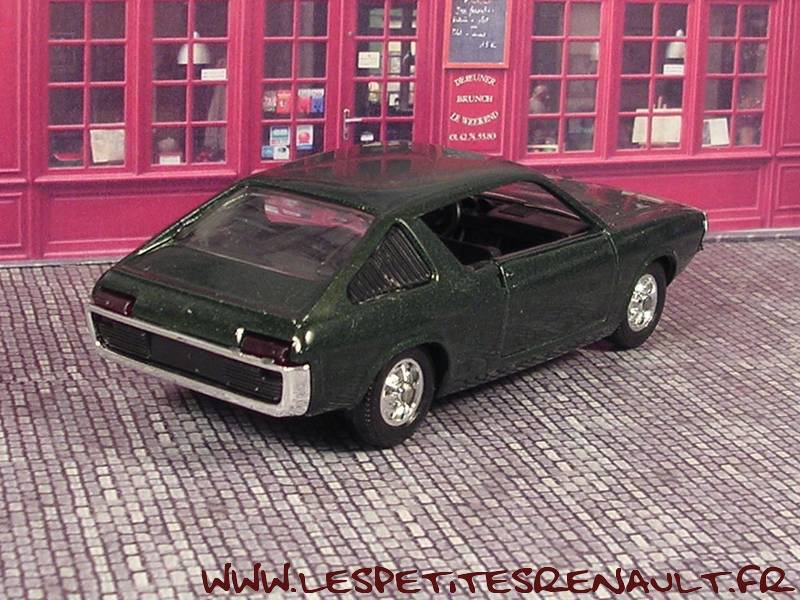 Modèle : Renault 17 TS Phase 1 Année : 1972 Couleur : Vert métallisé Echelle : 1/43 Fabricant : Verem Référence : 426 Collection : Non Matière : Zamak, châssis plastique Série limitée : Non Boitage : Boite cristal 6x15 Commentaires : Version fausse avec un capot sans bossage |