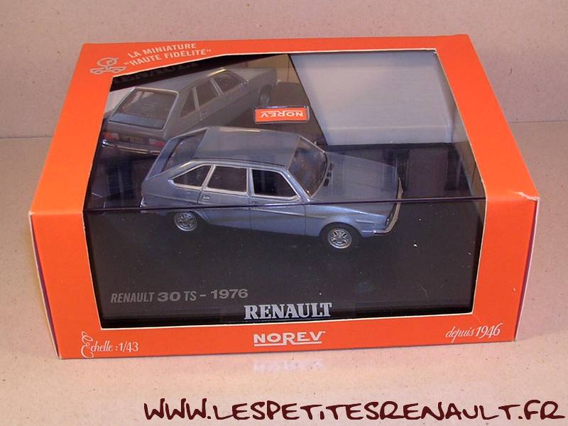 Modèle : Renault 30 TS Année : 1975 Couleur : Bleu métallisé Echelle : 1/43 Fabricant : Norev Référence : 513003 (Norev) Référence : 7711218660 (Renault) Collection : Non Matière : Zamak, châssis plastique Série limité : Non Boitage : Boite cristal 12x17, surboite Norev Commentaires : Version boutique |