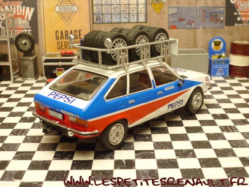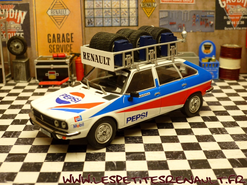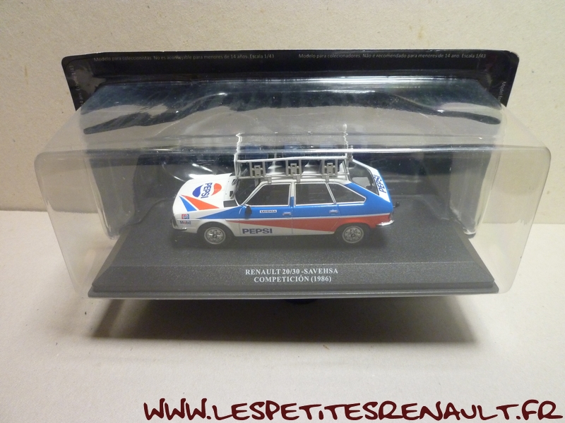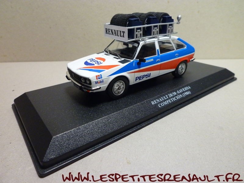 Modèle : Renault 30 TS Année : 1981 Couleur : Bleu, blanc et rouge Echelle : 1/43 Fabricant : Ixo Référence : 77 Collection : Véhicule d'assistance de rallye (Altaya) Matière : Zamak, châssis plastique Série limitée : Non Boitage : Socle + blister Commentaires : Véhicule d'assistance de l'écurie Savehsa Competicion. Socle marqué Renault 20-30, mais il s'agit bien d'une Renault 30 TS PRV6. |
