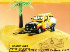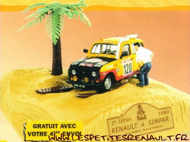 Modèle : Renault 4Année : 1980 Course : Dakar Equipage : N°120 - Bernard et Claude Marreau Couleur : Jaune et noire Fabriquant : Norev Référence : -- Collection : La légende du Dakar (M6) Matière : ABS, châssis zamak Série limité : Non Boitage : Diorama Commentaires : Offert en cadeau aux abonnés de la collection |