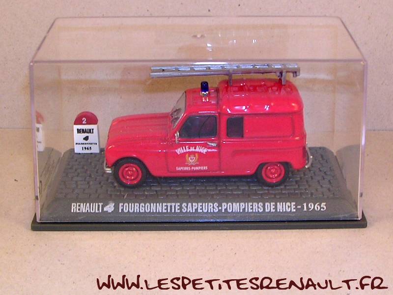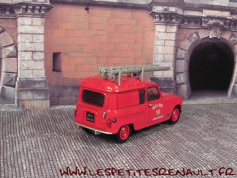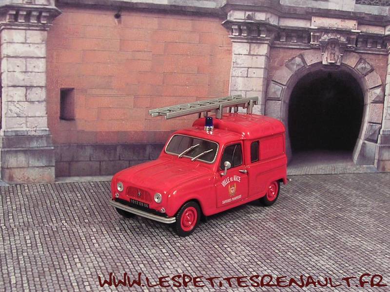 Modèle : Renault 4 semi vitrée PompiersAnnée : 1965 Couleur : Rouge Fabriquant : Universal Hobbies Référence : 2 Collection : Mythique R4 (M6) Matière : Zamak, châssis plastique Série limité : Non Boitage : Boite cristal 6x13 Commentaires : Décoration Pompiers, Ville de Nice. Version avec échelle sur le toit |