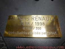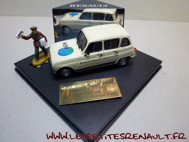 Modèle : Renault 4 GTL Année : 1978 Couleur : Beige Echelle : 1/43 Fabricant : Vitesse Référence : ACMA-1998-1 Collection : Non Matière : Zamak Série limitée : 168/200 Boitage : Boite cristal 11x11 Commentaires : Série limitée réalisée spécialement par l'ACMA pour l'anniversaire du centenaire de Renault |
