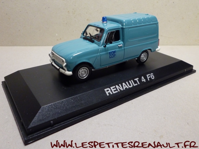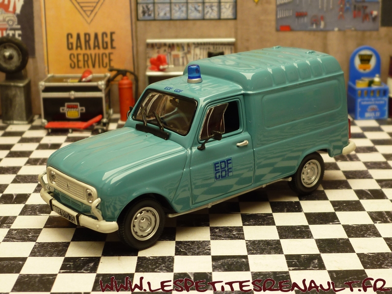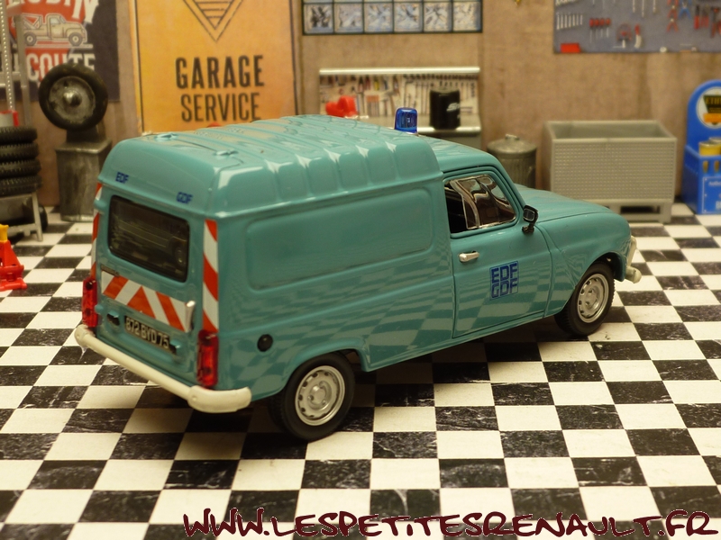 Modèle : Renault 4 F6 Année : 1980 Couleur : Bleue Echelle : 1/43 Fabricant : Norev Référence : 511052 Collection : Non Matière : Zamak, châssis plastique Série limitée : Non Boitage : Boite 8x15, surboite Norev Commentaires : Décoration EDF-GDF. En général les R4 F6 EDF-GDF étaient des modèles semi vitrés |