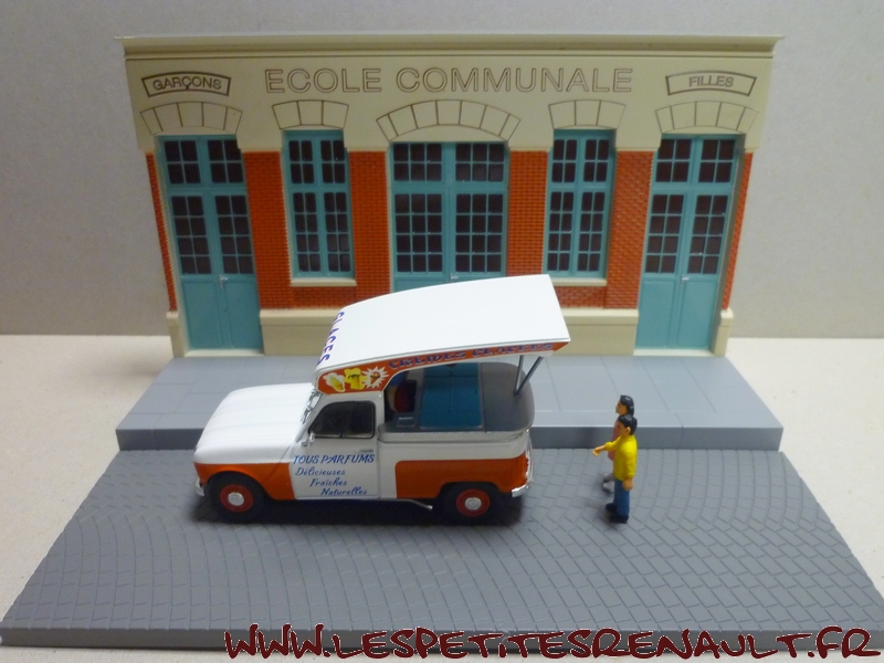 Modèle : Renault 4 Pick-up Année : 1967 Couleur : Blanche et orange Echelle : 1/43 Fabricant : Ixo Référence : 18 Collection : Véhicules utilitaires avec diorama (Altaya) Matière : Zamak, châssis plastique Série limitée : Non Boitage : Diorama + blister Commentaires : Version marchand de glaces |