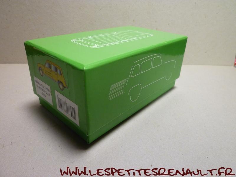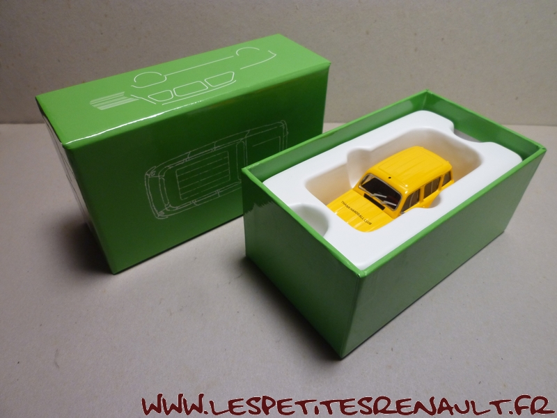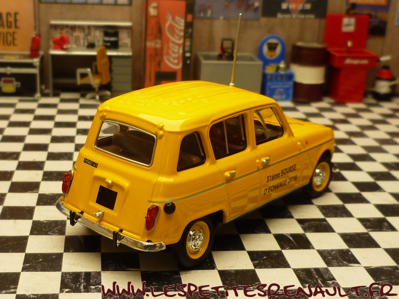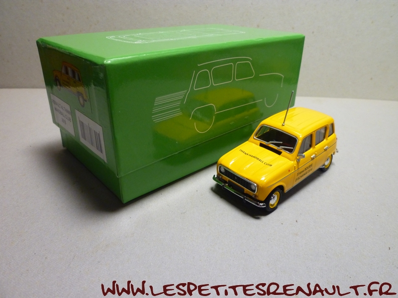 Modèle : Renault 4 Année : 1981 Couleur : Jaune Echelle : 1/43 Fabricant : Eligor Référence : Sans référence Collection : Non Matière : Zamak, châssis plastique Série limitée : Non Boitage : Boite carton Commentaires : Version promotionnelle réalisée pour la 31ème bourse d'échanges organisée par le Thann Hand Ball Club en 2016 |