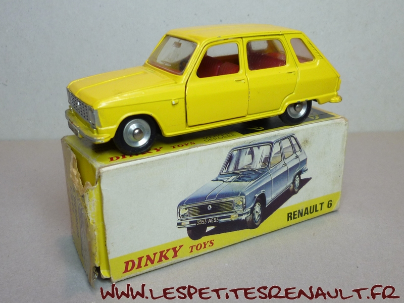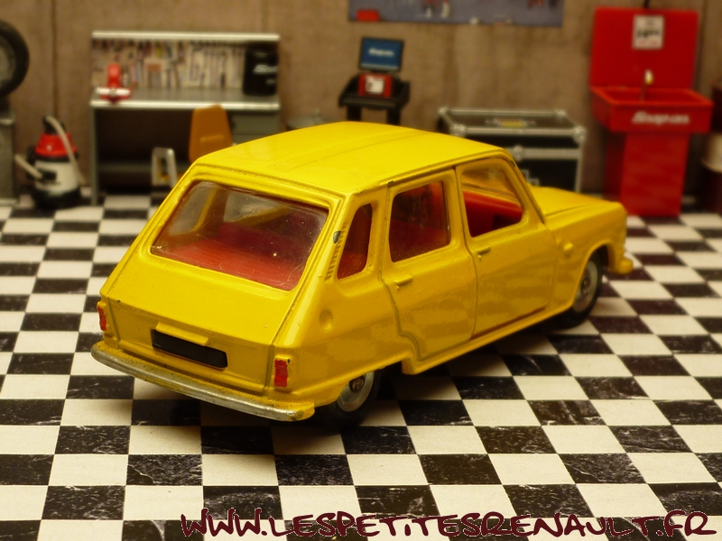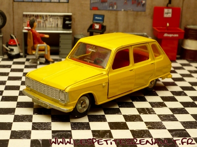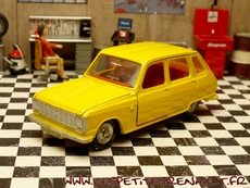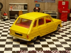 Modèle : Renault 6 phase 2 Année : 1974 Couleur : Jaune Echelle : 1/43 Fabricant : Dinky Toys Référence : 1416 Collection : Non Matière : Zamak, châssis plastique Série limitée : Non Boitage : Boite carton Commentaires : Production Dinky Toys Spain. Clignotants avant mal positionnés (devraient être dans le pare-chocs) |
