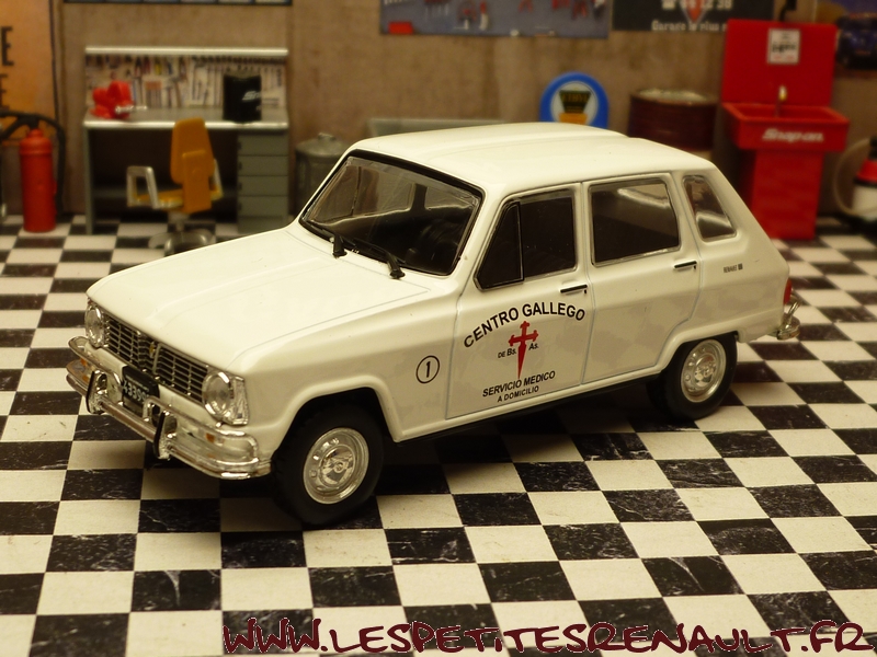 Modèle : Renault 6 phase 1 Année : 1971 Couleur : Blanche Echelle : 1/43 Fabricant : Ixo Référence : 47 Collection : Vehiculos Inolvidables de Reparto y Servicio Argentinos (Salvat) Matière : Zamak, châssis plastique Série limitée : Non Boitage : Boite cristal 7x15 Commentaires : Version Centro Gallego, service de soins à domicile. Hayon arrière badgé Ika-Renault |