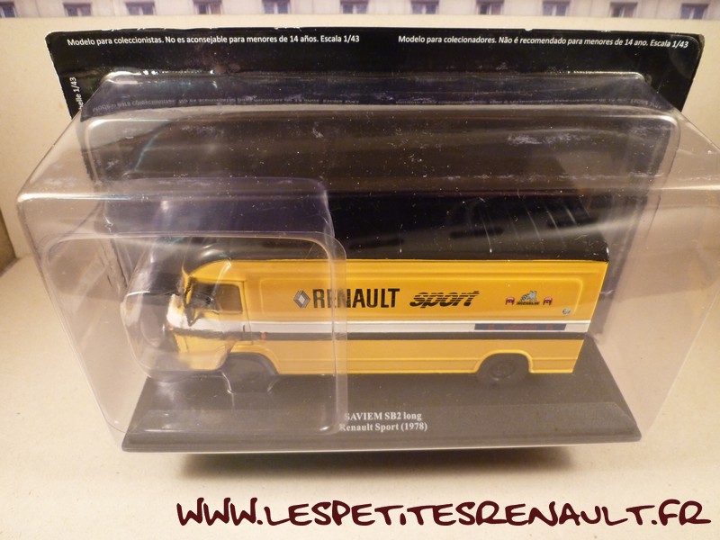 Modèle : Saviem SB2 fourgon long Année : 1978 Couleur : Jaune et noir Echelle : 1/43 Fabricant : Ixo Référence : 2 Collection : Véhicule d'assistance de Rallye (Altaya) Matière : Zamak, châssis plastique Série limité : Non Boitage : Socle + blister Commentaires : Version assistance Renault Sports |