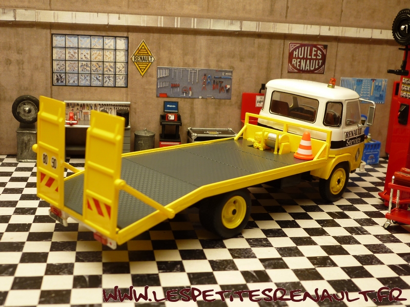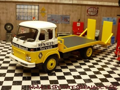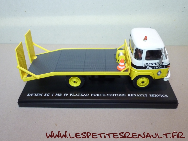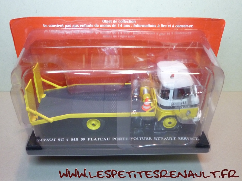 Modèle : Saviem SG4 plateau Année : 1972 Couleur : Jaune et blanc Echelle : 1/43 Fabricant : Ixo Référence : 26 Collection : Utilitaires Renault (Hachette) Matière : Zamak, châssis plastique Série limitée : Non Boitage : Socle + blister Commentaires : Version plateau porte voitures aux couleurs de Renault Services |