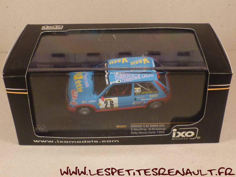 Modèle : Supercinq GT Turbo phase 1 Année : 1988 Course : Rallye de Monte Carlo Equipage : #26 - Mauffrey / Grateloup Couleur : Bleu ciel Echelle : 1/43 Fabricant : Ixo Référence : RAC227 Collection : Non Matière : Zamak, châssis plastique Série limitée : Non Boitage : Boite cristal + surboite Commentaires : -- |