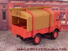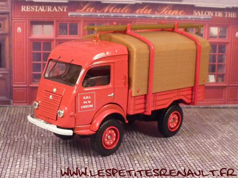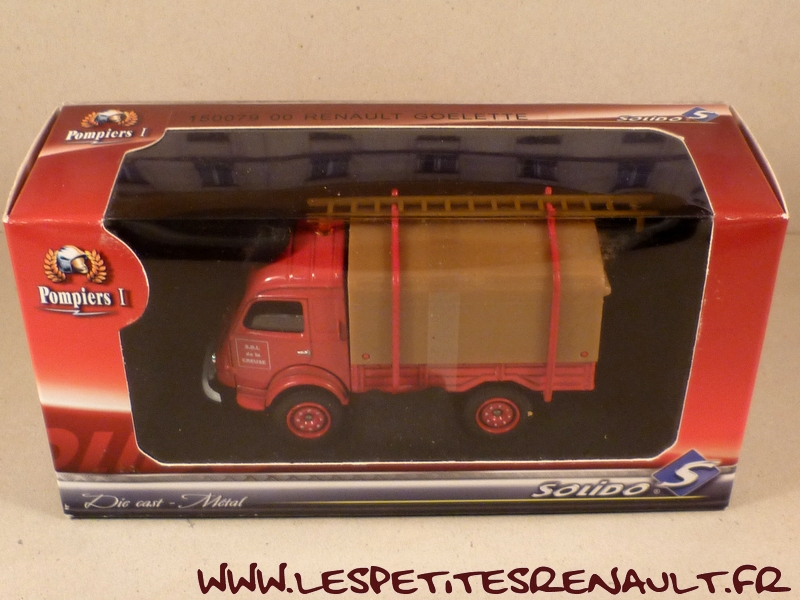 Modèle : 750 kg bâché Année : 1968 Couleur : Rouge Echelle : 1/50 Fabricant : Solido Référence : 150079 Collection : Pompiers I Matière : Zamak, châssis plastique Série limité : Non Boitage : Boite carton + Blister Commentaires : Type R2087. Version pompiers bâchée avec échelle sur le toit |