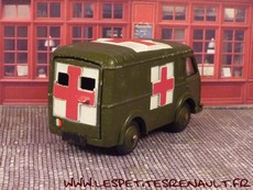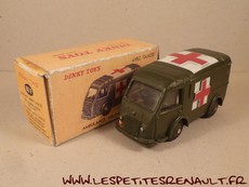 Modèle : Renault 1000 kg tôlé Année : 1956 Couleur : Kaki Echelle : 1/55 Fabricant : Dinky Toys Référence : 80F Collection : -- Matière : Zamak, châssis tôle Série limité : Non Boitage : Boite carton Commentaires : Type R2065. Version ambulance militaire. Modèle original avec châssis tôle et jantes convexes |