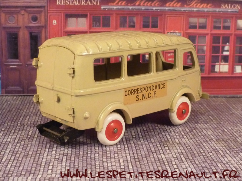 Modèle : Renault 1000kg autobus Année : 1954 Couleur : Beige Echelle : 1/45 Fabricant : CIJ Référence : 3/62 Collection : -- Matière : Zamak, châssis tôle Série limité : Non Boitage : Boite carton Commentaires : Version transport SNCF. Modèle sans plaque d'immatriculation à l'arrière sur le toit. |