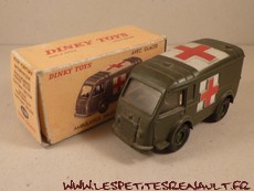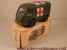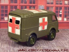 Modèle : Renault 1000 kg tôlé Année : 1956 Couleur : Kaki Echelle : 1/55 Fabricant : Dinky Toys Référence : 80F Collection : -- Matière : Zamak, châssis tôle Série limité : Non Boitage : Boite carton Commentaires : Type R2065. Version ambulance militaire. Modèle fin de production avec châssis et jantes plastique de nombreux détails supplémentaires sur le moule de la caisse (prise d'air, ...) |