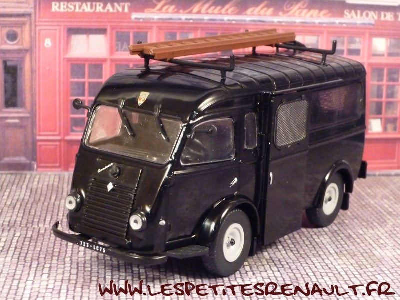 Modèle : Goélette vitrée Année : 1962 Couleur : Noir Echelle : 1/43 Fabricant : Ixo Référence : 46 Collection : Utilitaires Renault (Hachette) Matière : Zamak, châssis plastique Série limité : Non Boitage : Socle + Blister Commentaires : Version car de la Préfecture de Police de Paris. |