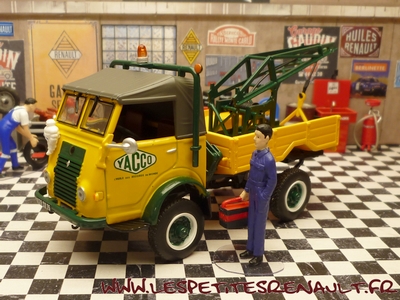 Modèle : 750 kg R2087 Année : 1957 Couleur : Jaune et vert Echelle : 1/43 Fabricant : Ixo Référence : 43 Collection : Véhicules utilitaires (Altaya) Matière : Zamak, châssis plastique Série limitée : Non Boitage : Diorama + blister Commentaires : Type R2087. Version dépanneuse Yacco. Modèle 1957 utilisé dans les années 70. Le fascicule parle d'une Goelette alors qu'il s'agit d'un 750kg |