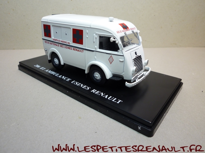 Modèle : 206 E1 Année : 1945 Couleur : Blanc Echelle : 1/43 Fabricant : Ixo Référence : 35 Collection :Utilitaires Renault (Hachette) Matière : Zamak, châssis plastique Série limitée : Non Boitage : Socle + blister Commentaires : Version ambulance utilisée au sein des usines Renault |