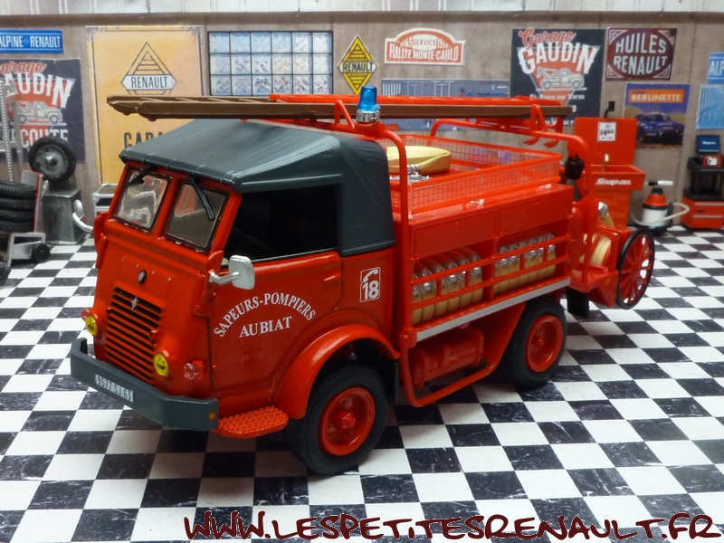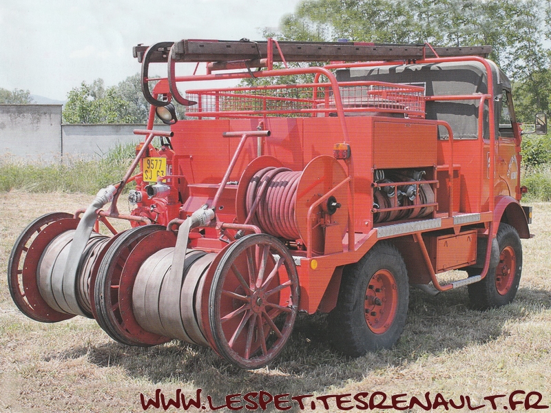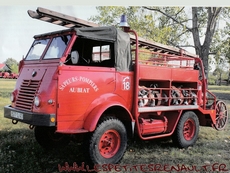 Renault type R 2087 4x4 750kg 1955 VPI des Sapeurs Pompiers d'Aubiat dans le Puy de Dôme Il s'agit d'un châssis de type R2087 à 4 roues motrices transformé pour pouvoir être utilisé en Véhicule de Première intervention (VPI) Initialement doté d'un moteur moins puissant, fin 1956, avec la sortie du nouveau moteur 4 cylindres Etendar 671, il devient le type R2087 Il sera finalement produit à plus de 16.000 exemplaire jusqu'en 1964 pour l'Armée, la Gendarmerie, les Sapeurs Pompiers et différents autres services mais restera opérationnel pendant de nombreuses années Ce modèle particulier a été modifié directement par les ateliers techniques des Sapeurs Pompiers d'Aubiat dans le Puy de Dôme Il a été transformé en VPI pour répondre aux besoins de la caserne Le plateau d'origine a été supprimé et une tonne à eau de 1000L a été installée en position centrale Les coffres latéraux permettent le rangement des tuyaux, et au dessus l'espace a été aménagé en plateforme permettant de transporter du matériel complémentaire Une banquette extérieure a été ajoutée et à l'arrière on retrouve une pompe Maheu-Labrosse de 500L/mn, un dévidoir d'urgence et deux dévidoirs mobiles Ce véhicule est resté en service jusqu'en 2007, ce qui explique la présence du gyrophare bleu |