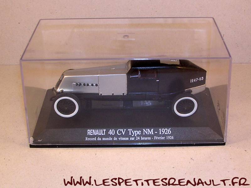 Modèle : 40 cv Record 1926 Année : 1926 Course : Record du monde des 24h février 1926 Equipage : Garfield / Pelissier Couleur : Gris métallisé et noir Echelle : 1/43 Fabricant : Universal Hobbies Référence : 78 Collection : Renault Collection (M6) Matière : Zamak Série limité : Non Boitage : Boite cristal Commentaires : Type NM. Version précédent celle qui portera la décoration bleue en juin 1926. |