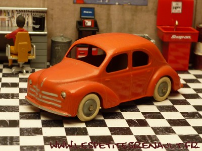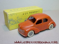 Modèle : 4 cv berline Sport Année : 1955 Couleur : Rouge orangé Echelle : 1/45 Fabricant : CIJ Référence : 3/49 Collection : -- Matière : Zamak, châssis tôle Série limitée : Non Boitage : Boite carton Commentaires : Version 3 moustaches, plancher riveté, pare-chocs moulés, roues en plastique et pneus blancs. |