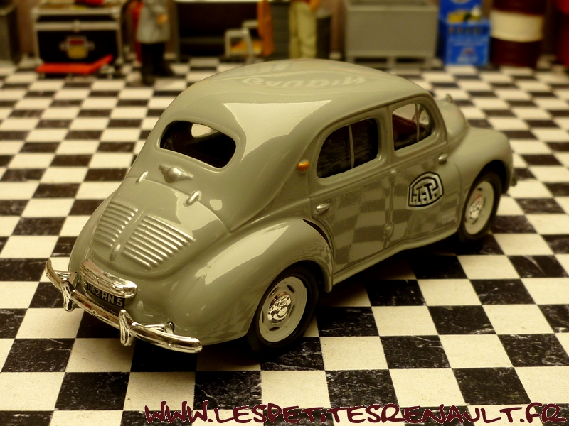 Modèle : 4cv berline Année : 1946 Couleur : Grise Echelle : 1/43 Fabricant : Norev Référence : 5 Collection : Véhicules postaux (Atlas) Matière : Zamak, châssis plastique Série limitée : Non Boitage : Socle + blister Commentaires : Version 6 moustaches avec décoration PTT noire sur les flancs |