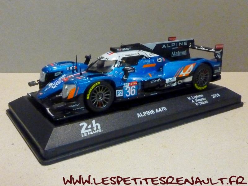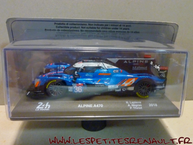 Modèle : Alpine A 470 Année : 2018 Course : 24h du Mans Equipage : #36 Lapierre-Negrao-Thiriet Couleur : Bleu métallisé Echelle : 1/43 Fabricant : Ixo Référence : 4 Collection : 24h Le Mans (Ixo Collections) Matière : Zamak, châssis plastique Série limitée : Non Boitage : Boite cristal + blister Commentaires : Vainqueur en catégorie LMP2 |