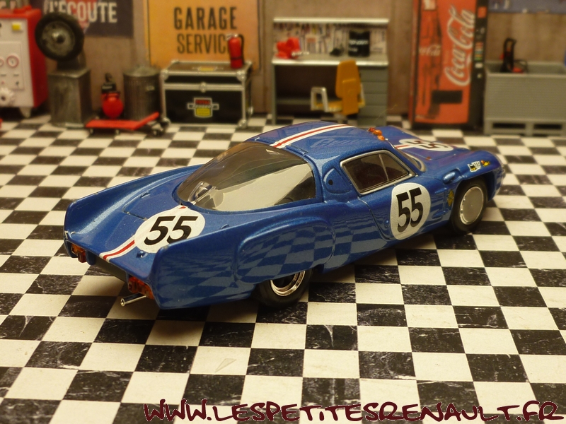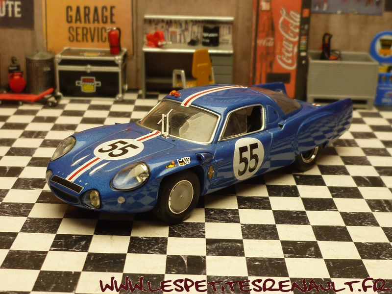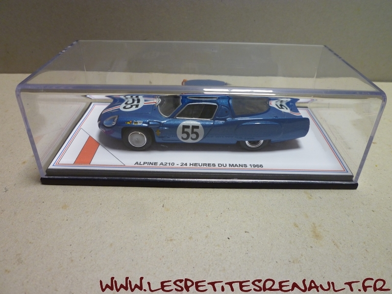 Modèle : Alpine A 210 1L Année : 1966 Course : 24 heures du Mans Equipage : #55 De Cortanze / Hanrioud Couleur : Bleu métallisé Echelle : 1/43 Fabricant : Base Ixo Référence : Inconnue Collection : Non Matière : Zamak, châssis plastique Série limitée : Oui Boitage : Boite cristal + surboite Commentaires : Abandon (pompe à eau) après 118 tours. Réalisation artisanale sur base Ixo |