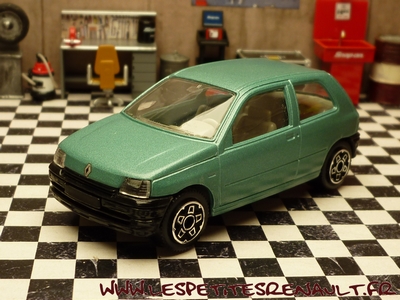 Modèle : Clio I ph1 RT Année : 1990 Couleur : Vert métallisé Echelle : 1/43 Fabricant : Bburago Référence : 4130 Collection : Non Matière : Zamak, châssis plastique Série limitée : Non Boitage : Boite carton + plastique Commentaires : Version fantaisiste destinée aux enfants |