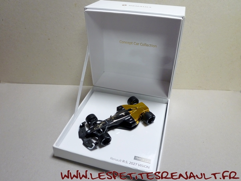 Modèle : RS 2027 Vision Année : 2017 Couleur : Noir et or Echelle : 1/43 Fabricant : Norev Référence : 7711785574 Collection : Non Matière : Résine Série limitée : 1946/4000 Boitage : Coffret carton Commentaires : Concept Car de la F1 du futur présenté lors du salon de Shangaï |