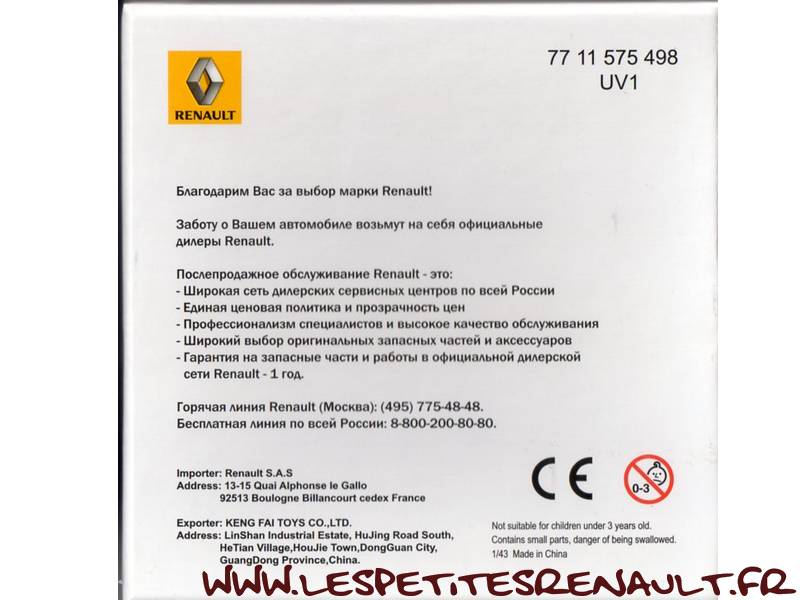 Modèle : Duster I ph 1 Année : 2010 Couleur : Marron métallisé Echelle : 1/43 Fabricant : Keng Fal Toys Référence : 7711575498 Collection : -- Matière : Zamak, châssis plastique Série limité : Non Boitage : Boite cristal 12x12 Commentaires : Duster I phase 1 de 1990. Il s'agit d'un exemplaire de miniature destiné au marché Russe (cf le dessous de la boite) |