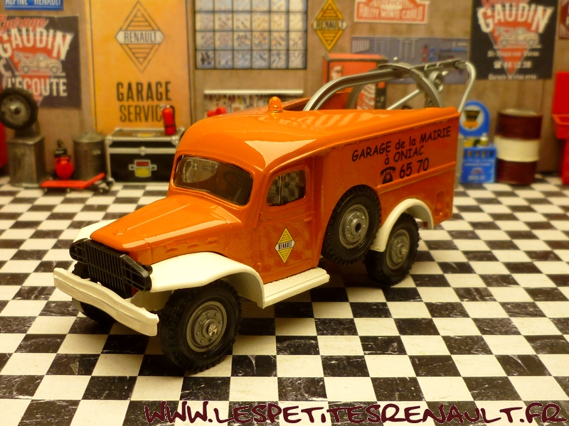 Modèle : Dodge WC 56 Année : 1940 Couleur : Orange et blanc Echelle : 1/50 Fabricant : Verem Référence : V298 Collection : Non Matière : Zamak et plastique Série limitée : Non Boitage : Boite cristal + surboite Commentaires : Annoncé comme WC56, mais peu probable car le WC56 était un véhicule châssis court de commandement. Véhicule utilisé comme dépanneuse dans les années 1970 |