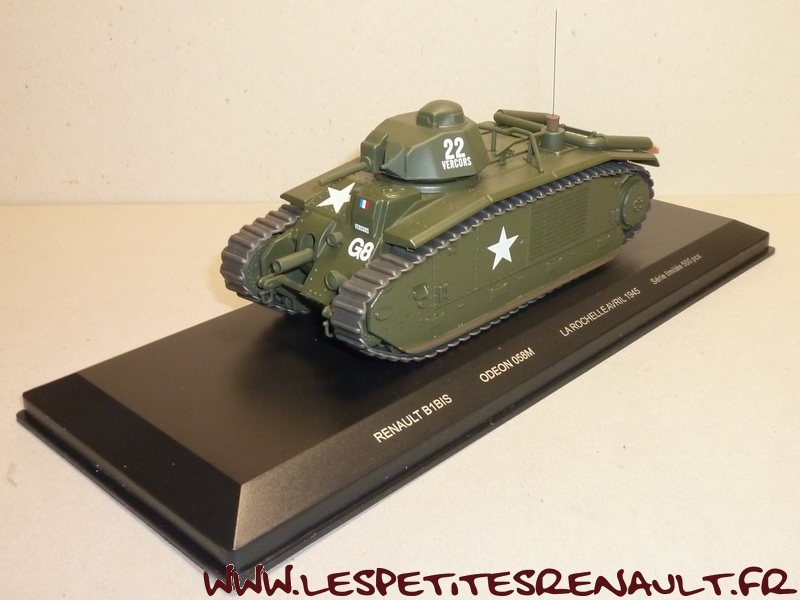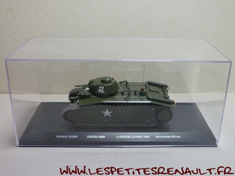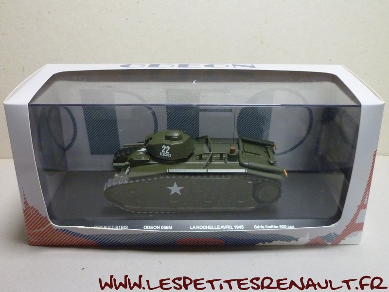 Modèle : Char B1 Bis Année : 1945 Couleur : Kaki Echelle : 1/43 Fabricant : Odéon Référence : ODEON58M Collection : Non Matière : Zamak et plastique Série limitée : 500 ex. Boitage : Boite cristal + surboite Odéon Commentaires : Exemplaire identifié "Vercors" dans sa version utilisée pour la libération de La Rochelle par le 13ème régiment de Dragons en 1945. |