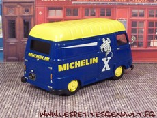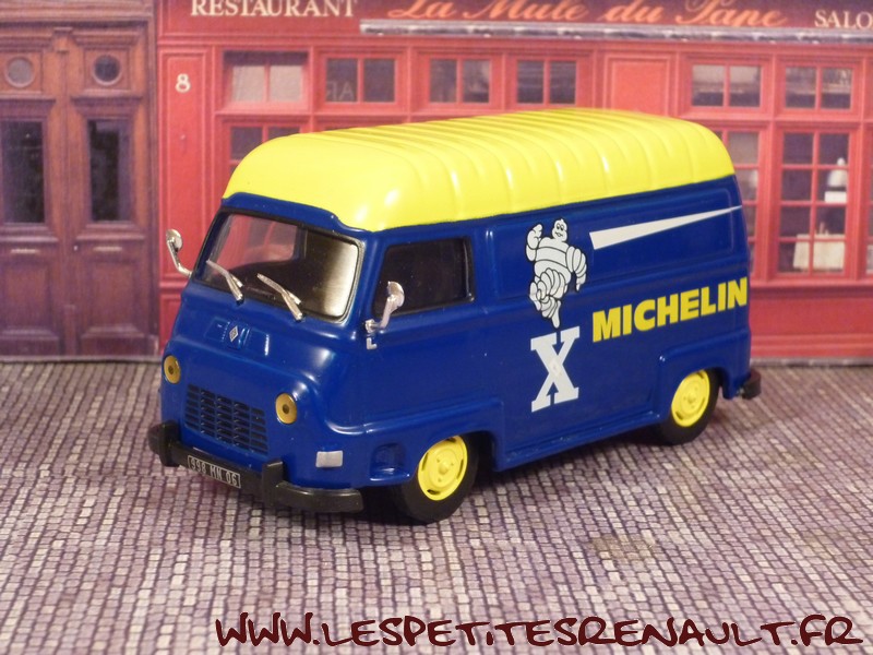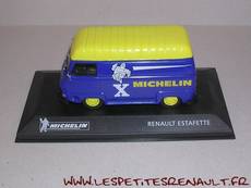 Modèle : Estafette tôlée réhaussée Année : 1975 Couleur : bleu et jaune Echelle : 1/43 Fabricant : Ixo Référence : 9 Collection : Michelin (Altaya) Matière : Zamak, châssis plastique Série limité : Non Boitage : Socle Commentaires : Décoration Michelin. La miniature n'est pas conforme, sur un modèle après 1973 avec la calandre en tôle, les marchepieds devraient être intégrés au pare-chocs |