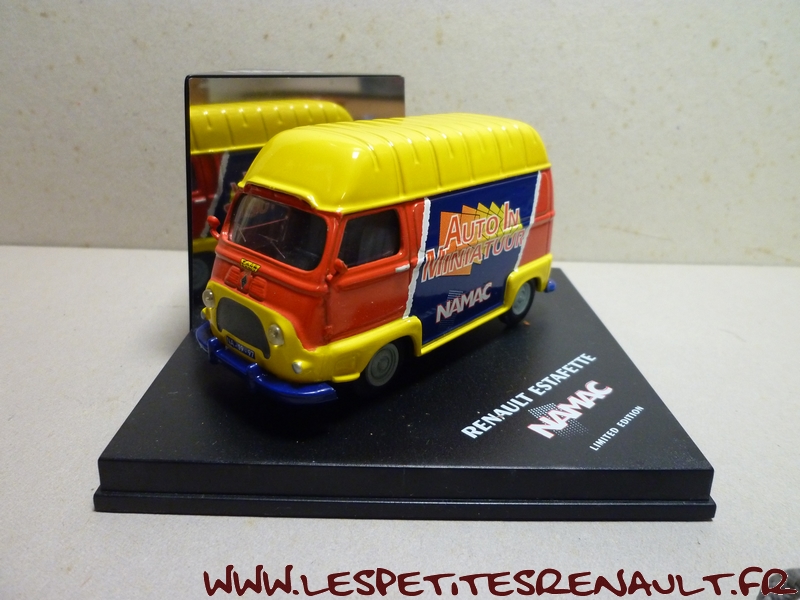 Modèle : Estafette tôlée réhaussée Année : 1960 Couleur : Jaune, orange et bleue Echelle : 1/43 Fabricant : City Référence : CV005C Collection : Non Matière : Zamak, châssis plastique Série limitée : 1500 ex. Boitage : Boite cristal 11x11 Commentaires : Version tôlée réhaussée réalisée pour la bourse de miniatures de Namac |