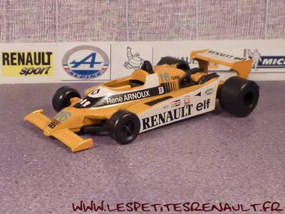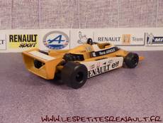 Modèle : Renault RS 01Année : 1979 Course : Argentine, Brésil, Afrique du Sud Pilote : n° 16 – B Arnoux Couleur : Jaune Fabriquant : Polistil Référence : CE105 Collection : -- Matière : Zamak, châssis plastique Série limité : Non Boitage : -- Commentaires : Utilisée sur les 3 premiers GP, puis à partir du GP d'espagne, la voiture sera remplacée par la RE 10. |