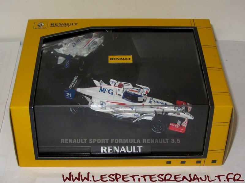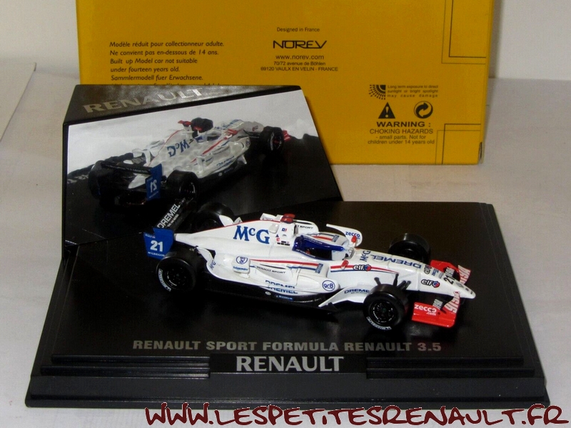 Modèle : Formule Renault 3.5L R29 Année : 2008 Course : World Series Equipage : #21 Van der Garde Couleur : Blanche Echelle : 1/43 Fabricant : Norev Référence : 7711427102 Collection : Non Matière : Zamak, châssis plastique Série limitée : Non Boitage : Boite cristal + surboite Commentaires : Vainqueur au général sur 2008 |