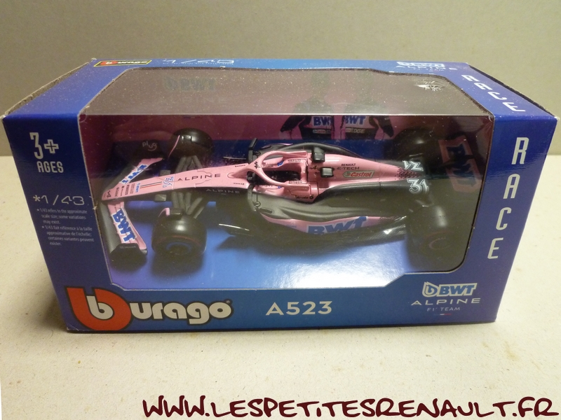 Modèle : Alpine A 523 Année : 2023 Course : GP Bahreïn Pilote : #31 - Esteban Ocon Couleur : Rose Echelle : 1/43 Fabricant : Bburago Référence : 18-3807201 Collection : Non Matière : Zamak, châssis plastique Série limitée : Non Boitage : Boite carton + plastique Commentaires : Couleur rose portée sur les 3 premier GP de la saison (Bahreïn, Arabie Saoudite et Australie) |