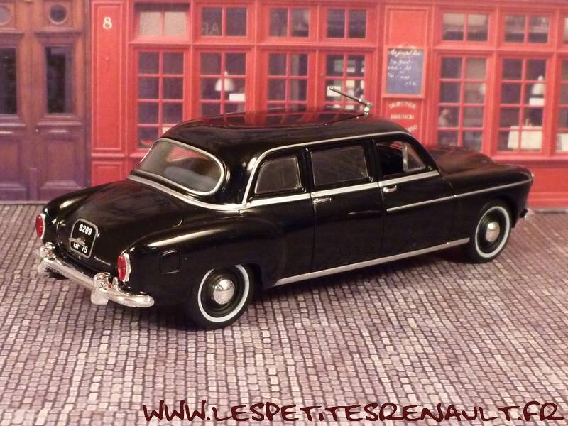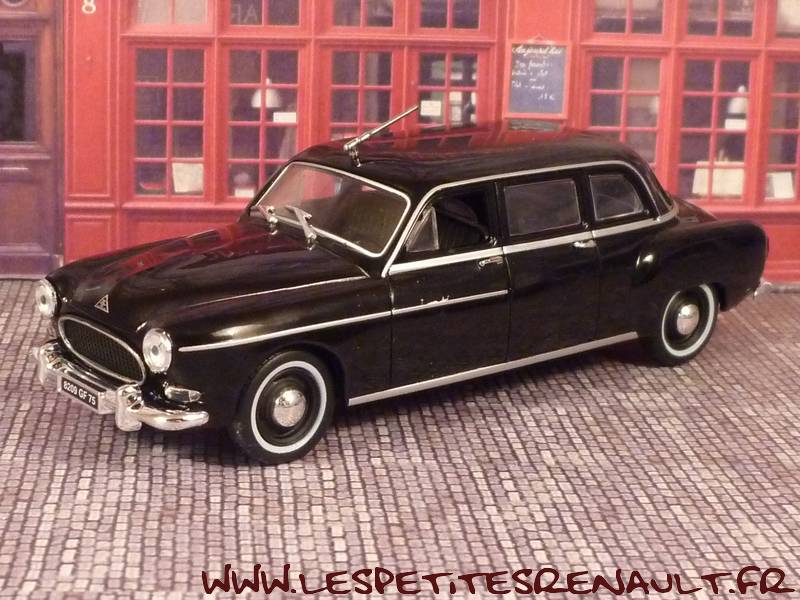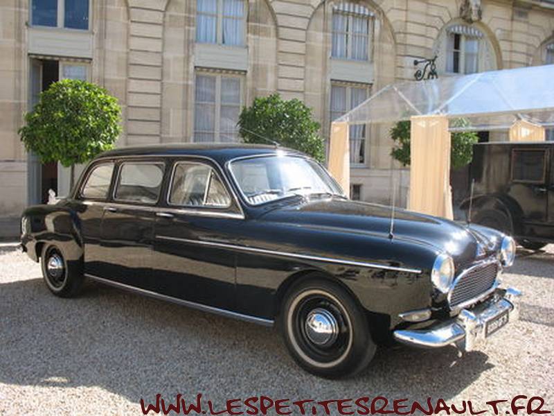La Renault Frégate Limousine est réalisée en un seul exemplaire en 1957 par le carrossier italien Ghia à la demande de la Régie Renault pour les besoins de l'Elysée (René Coty). Il s'agit pour le constructeur français de retrouver une place de prestige dans les cortèges officiels désormais conduits par les Citroën Traction Ghia a transformé la silhouette un peu molle de la Frégate en limousine de prestige à 6 glaces. L'essentiel réside dans l'allongement de la voiture qui gagne ainsi une soixantaine de centimètres. Le pavillon est rehaussé et les portes arrière sont désormais droites. Le compartiment arrière, très vaste est tendu de drap gris. Deux strapontins face à la route accueilleront interprètes, secrétaires ou aides de camp. Une séparation chauffeur impose une banquette avant très droite, serrée sur le volant. On verra la Frégate Présidence suivre la Traction présidentielle dans quelques défilés, mais sa carrière sera de courte durée. Utilisée par René Coty de 1957 à 1958, elle ne séduira pas le Général de Gaulle qui lui préférera la Simca Présidence ou la DS. Il faut dire que sa motorisation anémique de la Frégate ne plaide pas en sa faveur. Elle transportera le général Eisenhower en visite à Paris en 1959. |