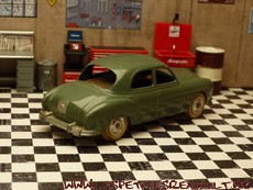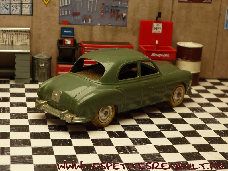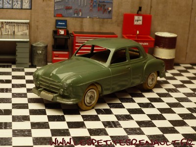 Modèle : Fregate Berline Année : 1953 Couleur : Kaki Echelle : 1/45 Fabricant : CIJ Référence : 3/51 Collection : Non Matière : Zamak, châssis tôle Série limité : Non Boitage : Boite carton Commentaires : Version à jantes en alu avec moteur mécanique à clé. Marquage châssis en relief |