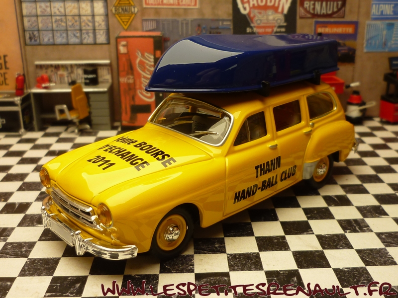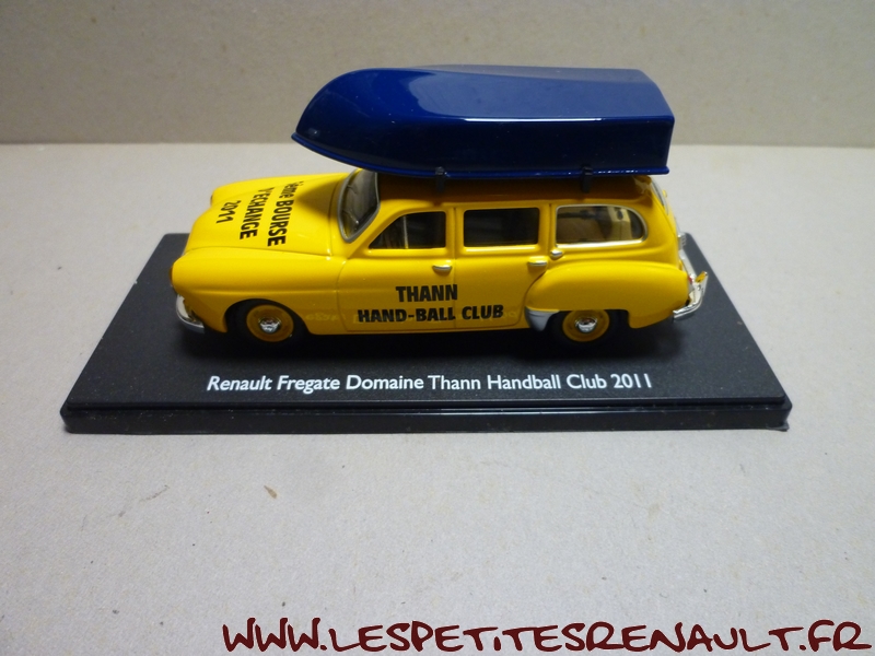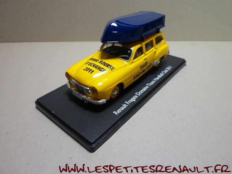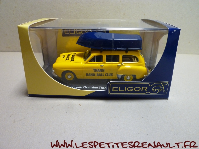 Modèle : Fregate Domaine Année : 1956 Couleur : Jaune Echelle : 1/43 Fabricant : Eligor Référence : 101415 Collection : Non Matière : Zamak, châssis plastique Série limitée : Non Boitage : Boite cristal, surboite Eligor Commentaires : Version avec une barque sur le toit. Modèle réalisé pour le Hand Ball Club de THann à l'occasion de la bourse d'échanges 2011 |