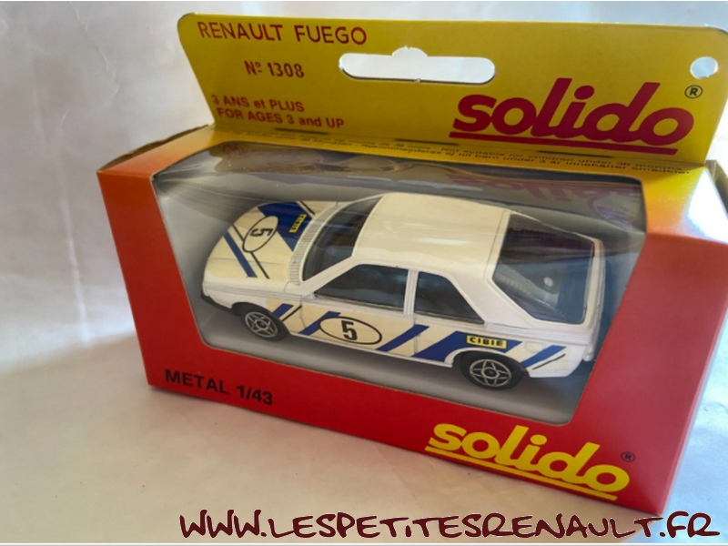 Modèle : Fuego 2L phase 1 Année : 1981 Course : Rallye Equipage : #5 Couleur : Blanche Echelle : 1/43 Fabricant : Solido Référence : 1308 Collection : Non Matière : Zamak, châssis plastique Série limitée : Non Boitage : Boite carton + cristal Commentaires : Décoration imaginaire |