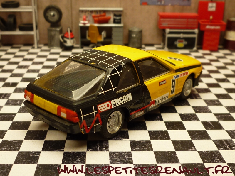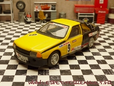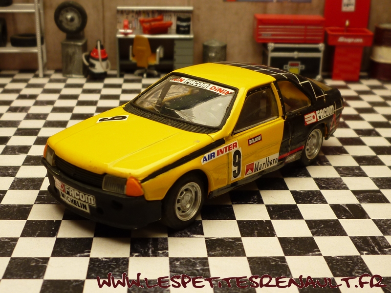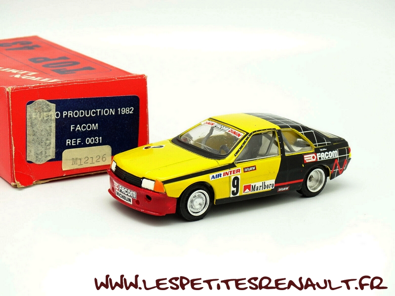 Modèle : Fuego 2L phase 1 Année : 1982 Course : Championnat Supertourisme Equipage : #9, Jacky Haran Couleur : Jaune et noire Echelle : 1/43 Fabricant : Top 43 Référence : 0031 Collection : Non Matière : Zamak, châssis plastique Série limitée : Non Boitage : Boite carton Commentaires : Transkit sur base Solido, décoration Facom-Dinin |