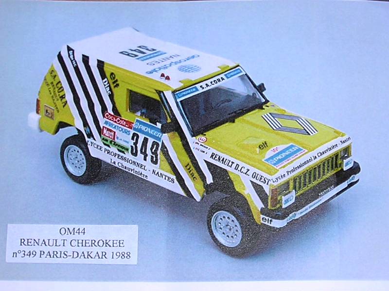 Modèle : Jeep Cherokee Année : 1988 Course : Paris-Dakar Equipage : #349 - Cadi / Douaud Couleur : Noir, jaune et blanc Echelle : 1/43 Fabricant : Original Miniatures Référence : OM44 Collection : Non Matière : Résine Série limité : Non Boitage : Boite carton Commentaires : -- |