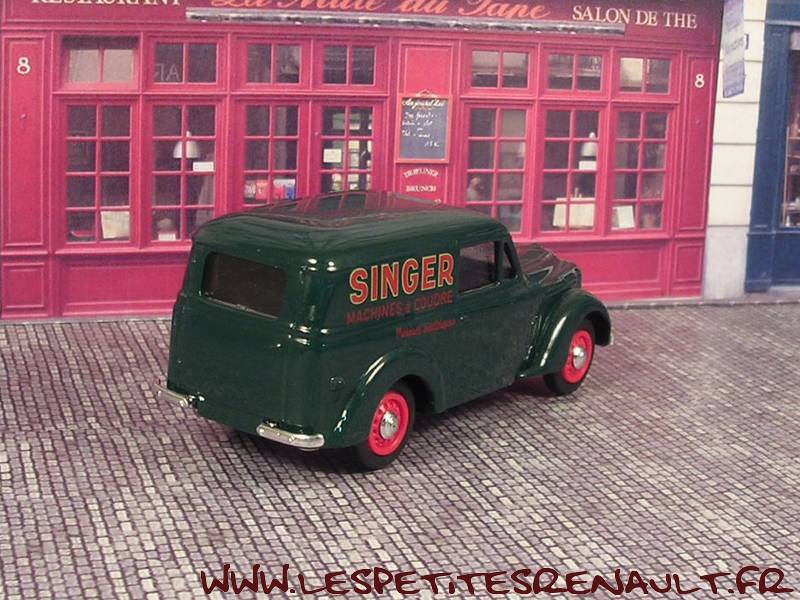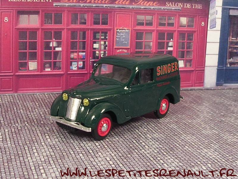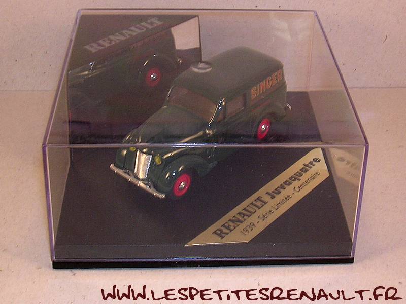 Modèle : Dauphinoise tôlée Année : 1956 Couleur : Verte Echelle : 1/43 Fabricant : Eligor Référence : 100684 Collection : Centenaire Renault Matière : Zamak, châssis plastique Série limitée : 1092/2500 Boitage : Boite cristal 11x11 Commentaires : Décoration Singer. Annoncée comme juvaquatre 1945, mais la caisse est celle d'une Dauphinoise. Il manque juste le logo Renault sur la calandre |