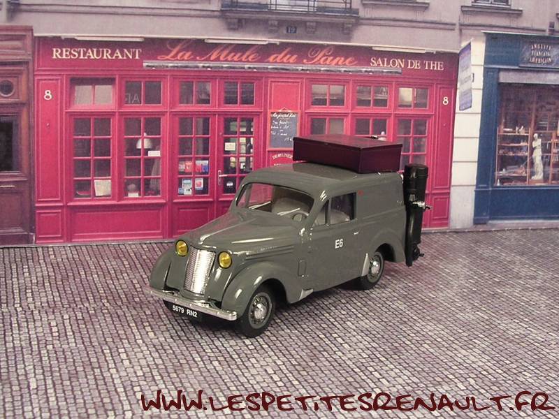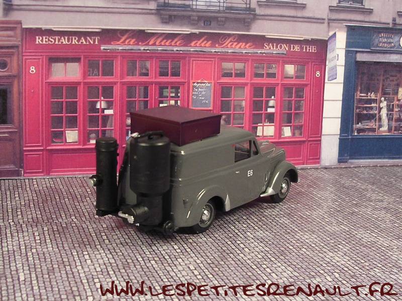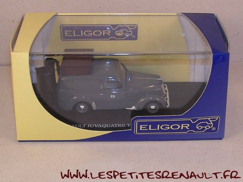 Modèle : Juvaquatre break tôlée Année : 1943 Couleur : Grise Echelle : 1/43 Fabricant : Eligor Référence : 101010 Collection : Non Matière : Zamak, châssis plastique Série limitée : Non Boitage : Boite cristal 7x15, surboite Eligor Commentaires : Version avec Gazogène. Utilisation d'une caisse de Dauphinoise (1956) incohérente avec l'utilisation du Gazogène. |